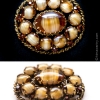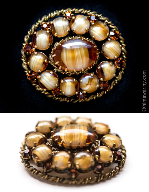 アガテのような縞目模様が閉じ込められた大粒ファセットカットのアートガラス、それを取り囲むラウンドシェイプのガラスが素敵なアンティーク・ブローチ。
