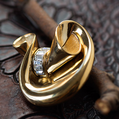艶やかなゴールドと、ラインストーンの輝き、ダイナミックな曲線で立体感のあるデザインがとてもゴージャス。しっかりとした重みのあるお品です。