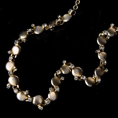 貝殻のような筋がエングレービング(彫り)されたメタルパーツのそれぞれに、2つずつラインストーンがプロングセット(爪留め)であしらわれたチョーカースタイルのヴィンテージ・ネックレス。エクステンションがあり、フック式のクラスプで長さは調節していただけます。