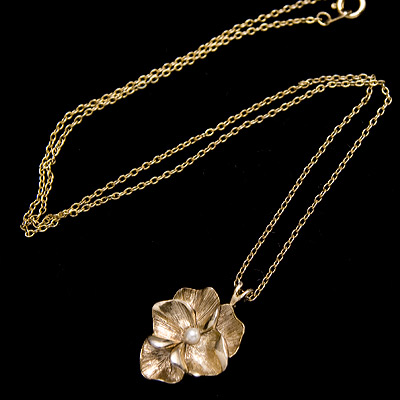 小さいながらにずっしりとした重みのあるパンジーのアンティーク・ペンダント・ネックレス。肉厚な花びらの表面には細かなエングレービングがほどこされ、カールして見える裏側の艶やかな部分と美しい対比を見せています。
