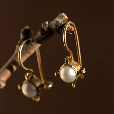 ワイヤーと真珠を留めた十字の台座のデザインが美しいシンプルでエレガントなアンティーク・ピアス。アンティークっぽい、真鍮(ブラス)のようなお色が素敵な、凛とした気品あふれるピアスです。