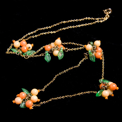 透明なグリーンの葉っぱ、ベージュオレンジとオレンジカラーの蕾の束が5箇所に散りばめられた少し長めのネックレス。2連で短めのチョーカーでキュートに、またそのままロングで少し大人っぽくエレガントに、違ったテーストでお楽しみいただけます。