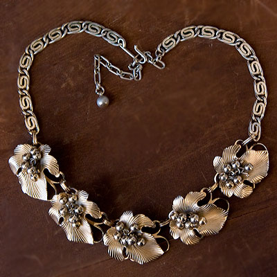 立体的な葉っぱのモチーフに、メタルの房がセットされたゴージャスなのにシンプルな、すっきりとしたデザインのヴィンテージ・チョーカー・ネックレス。