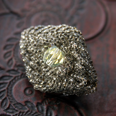 グレーのガラス製シードビーズがダイヤ型のベースにワイヤーで編み止められたヴィンテージ・ブローチ。中央にあしらわれたファセットカットが施されたビーズは、イエローグリーン味を帯びた色で光を反射し、全体のシックな印象の中でポイントとなっています。