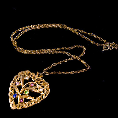 アメジストパープル系3色、サファイアブルー、アイスラインストーン、ペリドットグリーンのラインストーンの花が、ハートのフレームの中の植物モチーフにセットされたヴィンテージ・ペンダント・ネックレス。