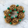 半珠透かし模様ミントターコイズビーズ・ブローチ 真珠の金古美小枝プチ・ブローチ