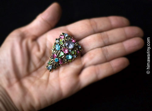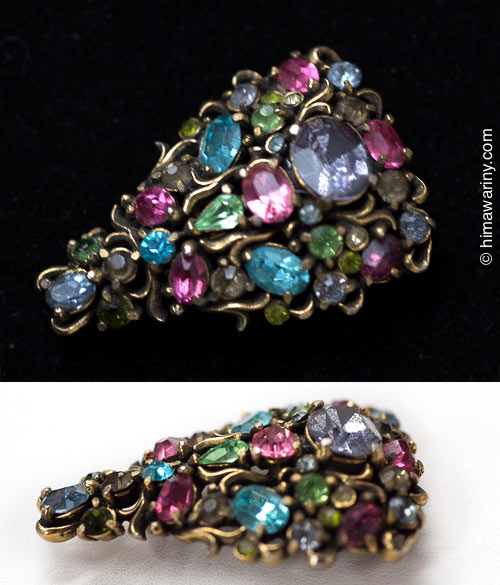 宝石のような実をたたえ、絡まり合いながら形作られた中世の騎士の盾のような立体感のあるトライアングルのオープンワーク・ベース。そこに、ラウンド、ティアドロップ、オーバルと、様々な大きさや形のラインストーンが散りばめられたアンティーク・ブローチ。