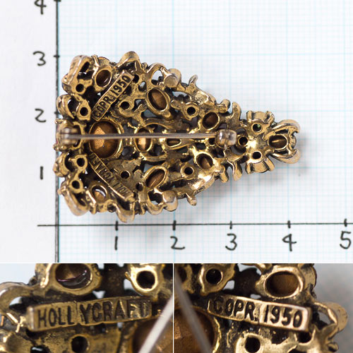 裏には1950とHOLLYCRAFTの刻印入り。Hollycraft ホリークラフトは、1938年にニューヨークで創立、1971年まで継続していたアクセサリー・ブランドで、このように制作年代をしばしばプレートに刻んでいます。
