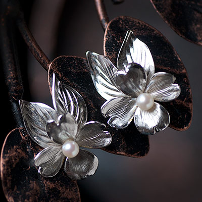 小さな真珠がハナミズキの花の中央にあしらわれ、葉っぱ2枚とあわせてデザインされた、とても女性らしい、やさしい印象のヴィンテージ・シルバー・イヤリング。スクリュー式のお品です。