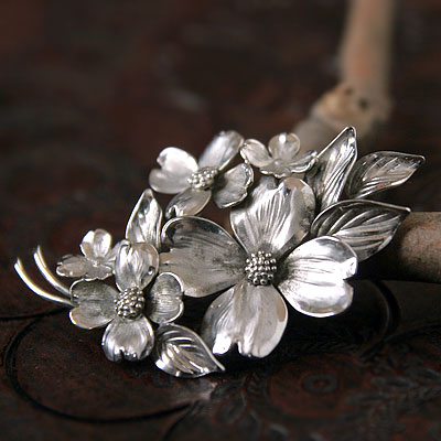 大小の花がそよ風に揺れ、あの花の香りまで届いてきそうなくらい見事な描写。スターリングシルバー(シルバー925)だけのクラフトで、花びらの質感をも見事にとらえたハナミズキの小枝のヴィンテージ・ブローチです。