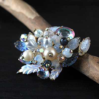 パール、オーロラ加工がほどこされたカットガラスやラインストーン、マーキースシェープで透明なガラスの中に乳白色の模様が入ったプレスガラス(型押しガラス)、つぼみのようなブルーグレーのパールと淡いブルーが買った乳白色のビーズでできたブーケのようなアンティーク・ブローチ。