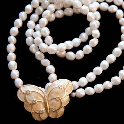 そのままストレートに二連でも、ねじっても、また蝶を胸のセンターにしたり、首の近くにもってきたり、またまたショートヘアの方や、アップにして背中の開いたドレスの場合だと後ろにもってきて前からはクラッシーな二連バロックパール・ネックレスで、後ろ姿がキュート!etc.いろいろ「着こなし」自在なのも魅力です。