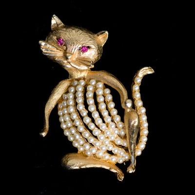 ピンクのルビーカラーの瞳がカワイイヴィンテージのキャット・ブローチ。ラインストーンがうめこまれたアーモンドシェープの目、おなかの部分はオープンワークで、シードパールはおなかだけでなく、細い尻尾にまでセットされたとても手のかかったお品です。