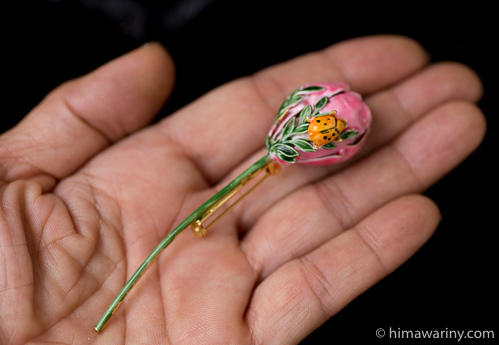 桃色のチューリップのような花、あるいは蕾に葉っぱが寄り添い、そこにちょこんとオレンジ色のレディーバグ=テントウムシがとまった何とも愛らしいヴィンテージ・ブローチ。