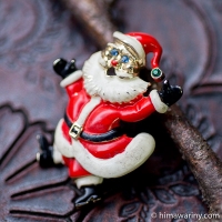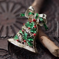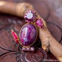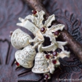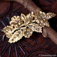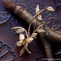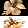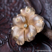 とても写実的なテクスチャーが描かれた花びら、その上に3枚の葉っぱ、そしてラインストーンが先端に据えられた雄しべという構成がとても個性的なヴィンテージ・ブローチ。