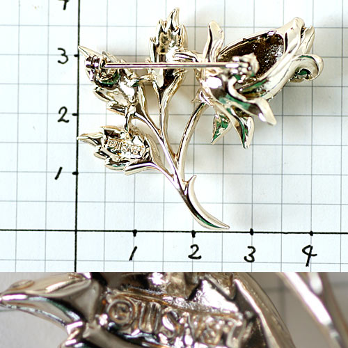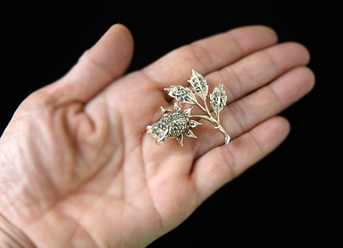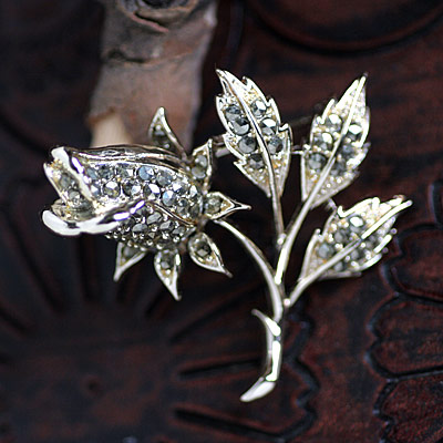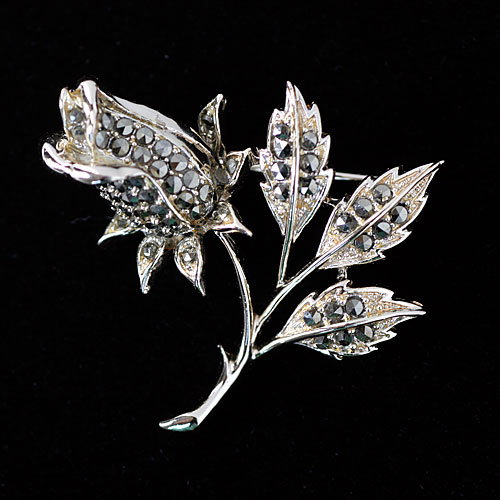 ダークグレイの鉱石のように光るフェイク・マーカサイトがびっしりと埋め込まれた立体的な薔薇の蕾が印象的なヴィンテージ・ブローチ。