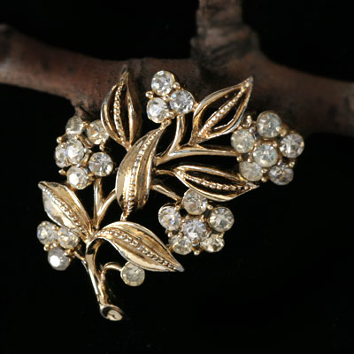 5枚の花びらで満開になったラインストーンのお花が3つ、そして蕾がそこここに散りばめられたエレガントなヴィンテージ・フラワー・ブローチです。