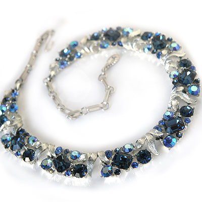 深いサファイヤブルーの大粒エメラルドカット・ラインストーンと、その周りに散りばめられたラウンドストーンのブルー系のラインストーンが美しいチョーカー・スタイルのヴィンテージ・ネックレス。
