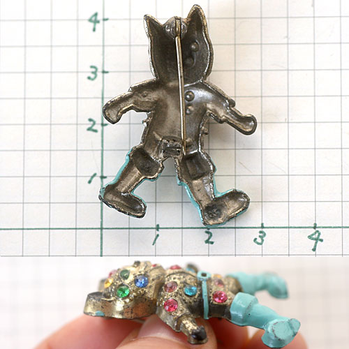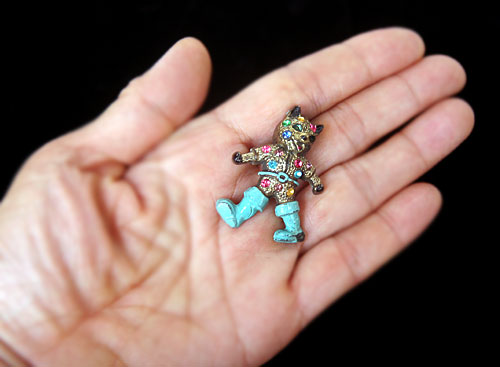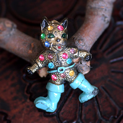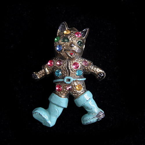 エメラルドグリーン、フューシャ、アクアマリン、サファイヤブルー、オレンジシトリン色のラインストーンが埋め込まれたキャットモチーフのアンティーク・ブローチ。