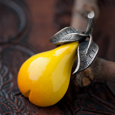 フルーツの部分は、陶器にエナメルペイントしたような質感。燻し銀色の彫刻のような葉っぱと軸と対比をなして、大人っぽく明るいお色をお楽しみ頂けるお品です。