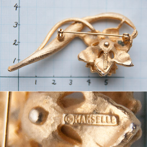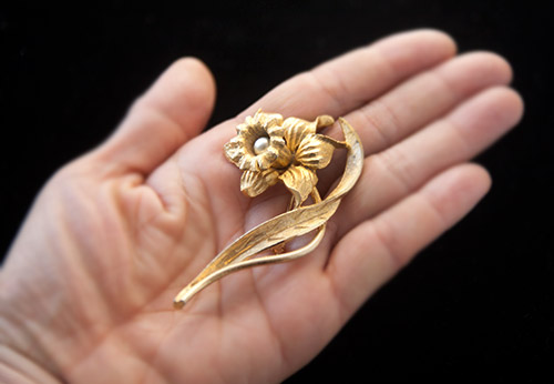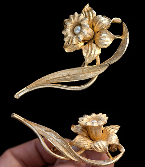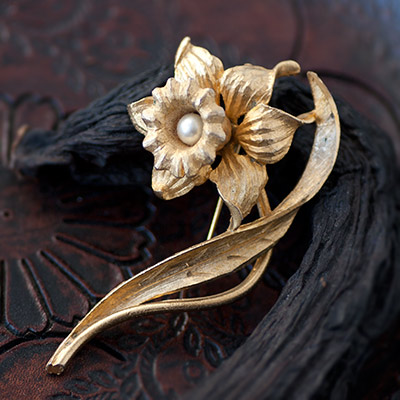 スイセンの花をとても写実的に表現した立体的な彫刻のようなヴィンテージ・ブローチ。中央のラッパのような花びらの中には、一粒パールがあしらわれています。
