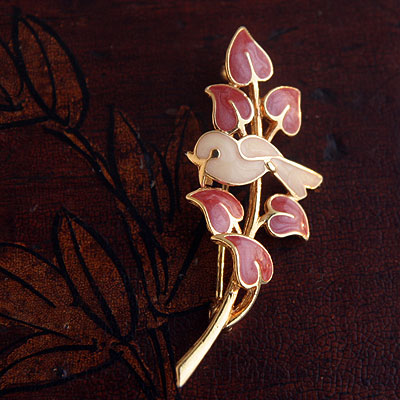 ハートの葉っぱの小枝にとまってさえずる小鳥のブローチ。有線の七宝焼きのようにエナメルペイントが流し込まれたような造りで、葉っぱも小鳥も微かにパールっぽいマーブル模様のような感じでかわいいです。