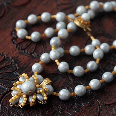 ●サイズ:長さ73cm、メインパーツ 3cm x 3.5cm (金具含まず)、ネックレス部分の灰青ビーズ約9mm 径