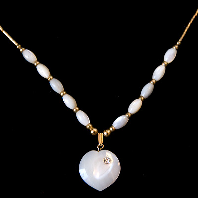 ラインストーンが埋め込まれたハートがかわいいヴィンテージ・ネックレス。ハートペンダントパーツとおそろいで乳白色のガラス質のビーズは、マザー・オブ・パール製。Mother of Pearl、つまり真珠の母。真珠を生み出す貝(白いものは、一般的には白蝶貝)で、 石ではありませんが、天然石同様の力があるパワーストーンで、女性の内面的な魅力を引き出したり、精神・肉体を守り育むとされています。