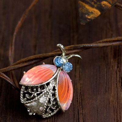 ライトブルーのラインストーンの目、とても不思議なカラーのオールド・プラスティック・カボションが羽根のテントウムシのヴィンテージブローチです。カボションは、半透明の淡いピンクの乳白色で、中にオレンジ色の部分があり、それが見る角度によって光を反射する様がとても綺麗です。