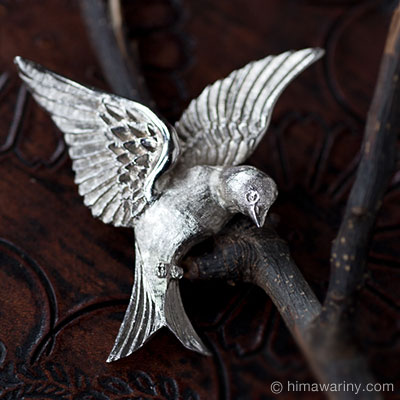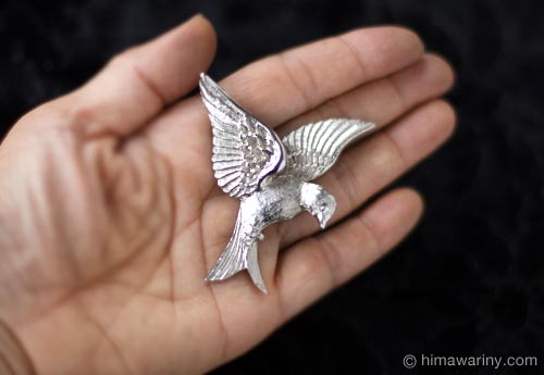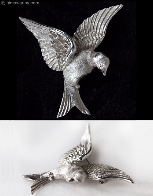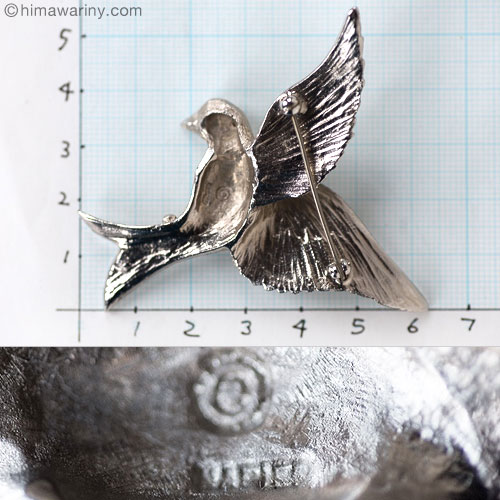 鳥の羽ばたく音が聞こえてきそうなくらい見事に飛翔の瞬間を捉えたヴィンテージ・バード・ブローチ。全体に繊細なエングレービングがほどこされ、羽毛のしなやかさが伝わってきます。翼のディティールが特に素晴らしく、雨覆い(あまおおい)と呼ばれる羽根と、風切り羽もしっかりと描き分けられたこだわりのクラフトワーク。