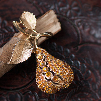 夕日を浴びて輝いているようなお色のラインストーンのパヴェ。ぷっくり立体的な西洋梨モチーフのヴィンテージ・ブローチ。