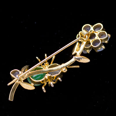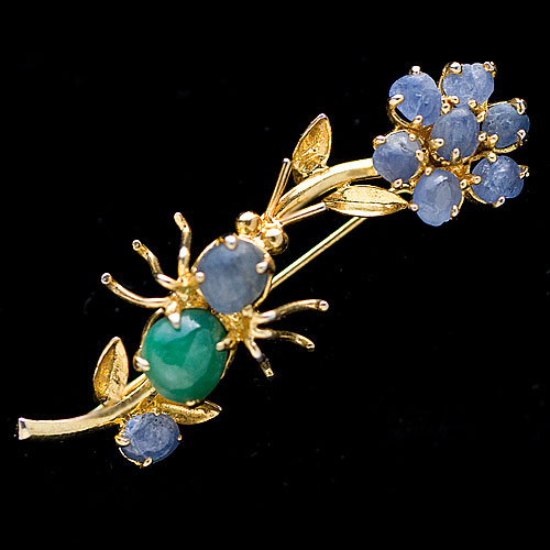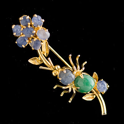 スモーキーブルーの濃淡のある天然石の花に惹かれて蜘蛛が茎をよじ登っている様がデザインされたヴィンテージ・ブローチ。2対の葉っぱのうち、下方にも青い石が。こちらは蕾か、朝露でしょうか。