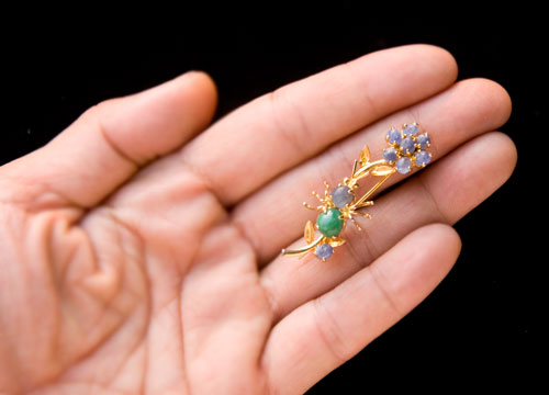 全体は波形の細長いフォルムにブルーとグリーンの石が散りばめられ、とてもエレガントにかわいらしいお品。コーディネートの際、さりげなくお色を添えることができる使いやすいお品です。