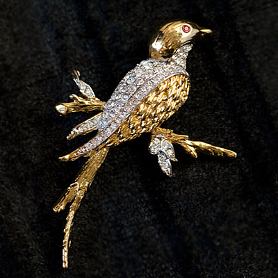 枝にとまった小鳥のブローチ。枝、葉、羽根にはクリア・ラインストーンが埋め込まれ、瞳にはルビー色のラインストーンが埋め込まれ、ゴールドカラーとともに美しく輝いています。
