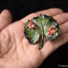 葉っぱの上にとまっている2匹のテントウムシが、飛び立とうとしている瞬間を捉えたヴィンテージ・ブローチ。