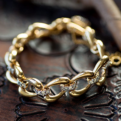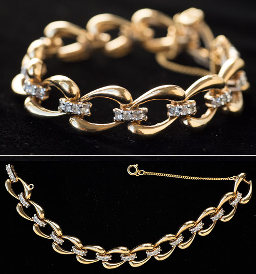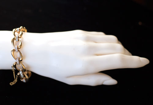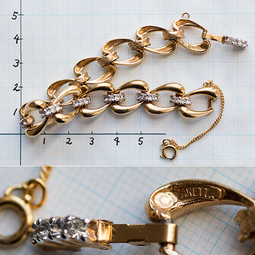 ティアドロップが2つつながったようなパーツが、太鼓橋のような台にクリスタルクリアなラインストーンが積めど召されたパーツでリンクしたヴィンテージ・ブレスレット。