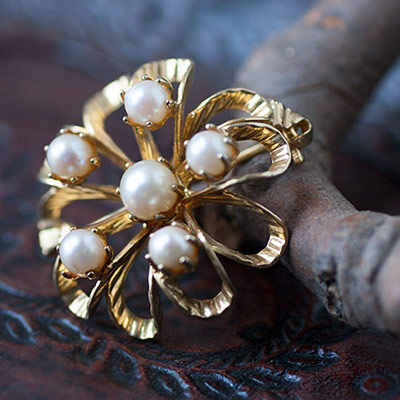 花びらが波々としたオープンワークで、高さのあるころんとしたお花モチーフがキュートなヴィンテージ・ブローチ。中央に大粒の真珠、周りに5粒やや小さめの真珠がプロングセット(爪留め)されています。