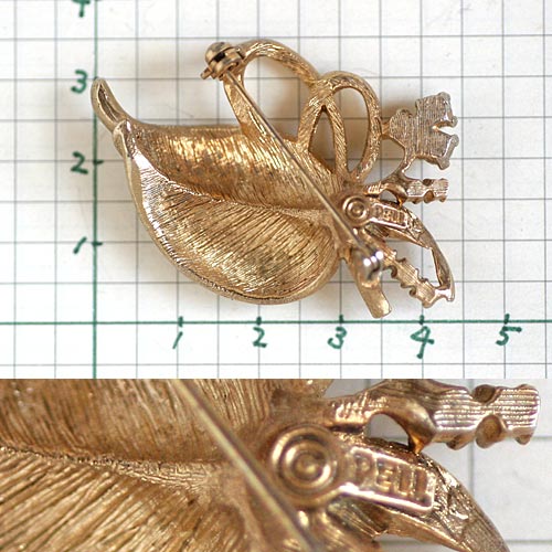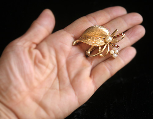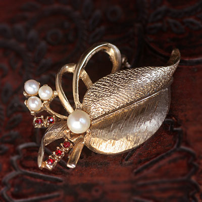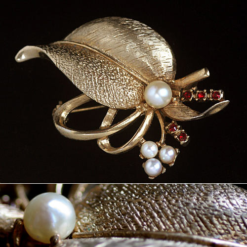 アンティーク味をやや帯びたゴールドの葉っぱに、水引のようなリボンがあしらわれ、真珠の実がコサージュのようにまとめられたヴィンテージ・ブローチ。