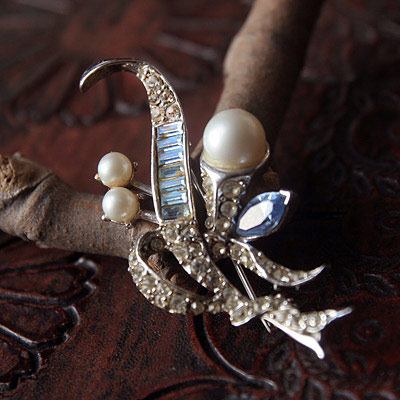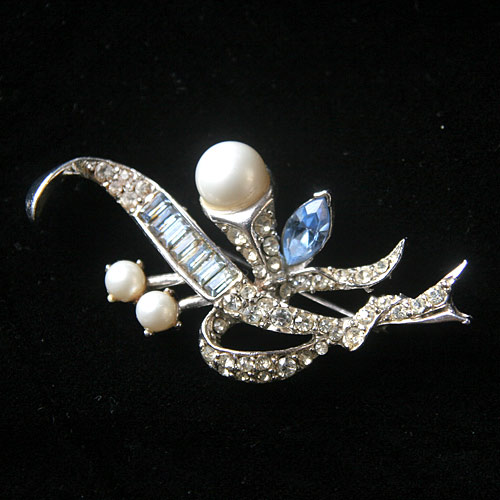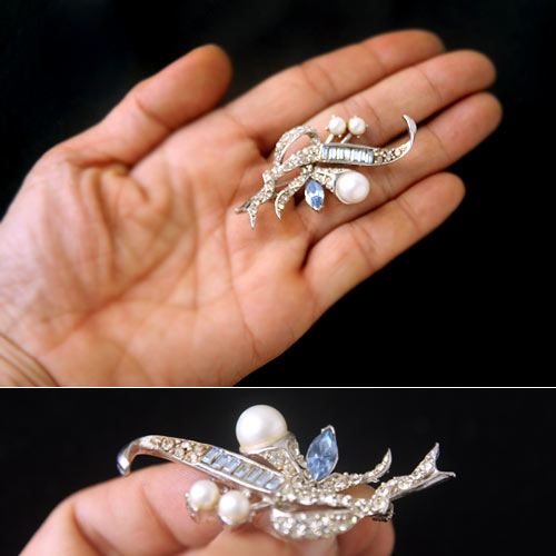 ややマットな大粒パールと、小さな2つのパールの花が絶妙なバランスであしらわれ、葉っぱとガクの部分にはラインストーンのパヴェ。センターにはバゲットシェープの淡いブルーのラインストーンと、とても凝ったフラワーモチーフのアンティーク・ブローチ。