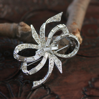 立体的なリボン・モチーフのヴィンテージ・ブローチ。バゲット・シェイプのラインストーンと、ラウンド・シェイプのラインストーンが、リボンの表側と裏側と両面にびっしりと埋め込まれていて、上品にゴージャス・エレガントなお品です。