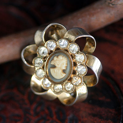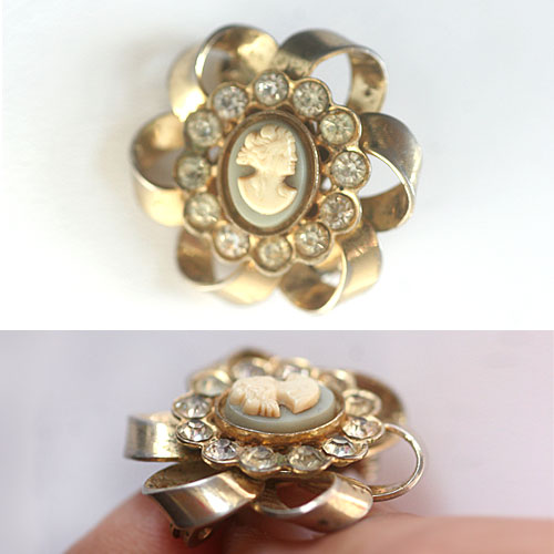 モスグリーンがかったグレーの土台にアイボリーカラーの貴婦人のレリーフのカメオ・カボション、その周りをぐるりとラインストーンが取り囲み、更にリボンで作ったお花のようなデザインで構成されたヴィンテージ・カメオ・ブローチ。