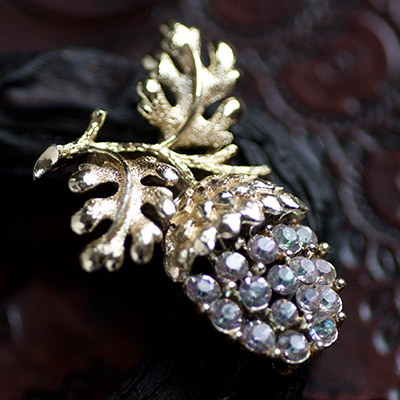 やさしいパープル系のお色のラインストーンが、ゆるやかなドーム状のオープンワーク・ベースにセットされた美しいドングリのヴィンテージ・ブローチ。