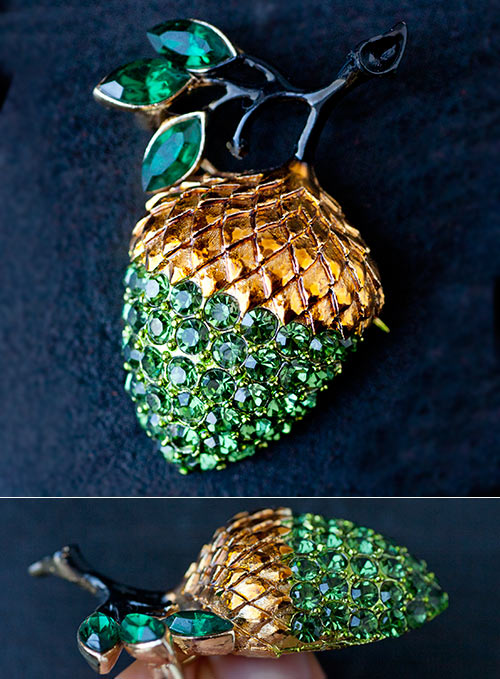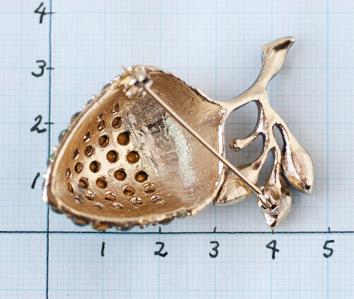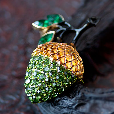 オリーブグリーンのラインストーンのパヴェが美しいドングリ・モチーフのヴィンテージ・ブローチ。写実的に表現された立体的な袴/帽子には、オレンジ味をおびた透明感のあるペイント、葉っぱにはエメラルドグリーンのマーキースシェイプのラインストーン、枝は漆黒ジャパンブラックのペイントがほどこされています。