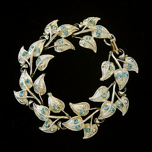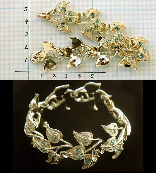 ヴィンテージ・アクセサリーならではの、グリーン味がかったライトなゴールドカラー・メタルとアクアマリン・ブルーの組み合わせで、ボリューミーですが植物モチーフの曲線とあいまって、やさしい印象のあるブレスレットです。
