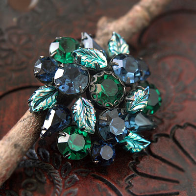 ●カラー、材質:真鍮カラー・メタルに黒、ラインストーン、葉っぱ型ガラス・カボション