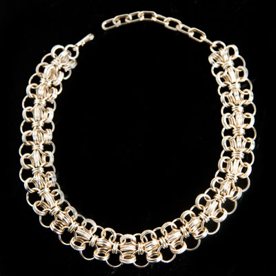 表面のテクスチャー、大きさ、形、巻き数の違う5種類のリングを組み合わせたデザインのヴィンテージ・チョーカータイプ・ネックレス。