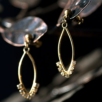 瞳の形のフープに、7つのラインストーンが輝いているヴィンテージ・ピアス。ゆらゆらとゆれるオープンワークのゴールドのフォルムと、その先端できらきらと輝くたたずまいがとても素敵なお品です。