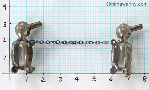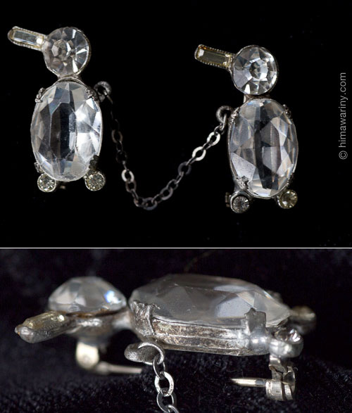 嘴はバゲットシェイプ、頭と足はラウンドシェイプのラインストーン、そしてボディはスリットの入ったバックオープンスタイルのベースに留められたオーバルシェイプのファセットカットガラスという凝った造りのアンティーク・ペンギン・ブローチ。