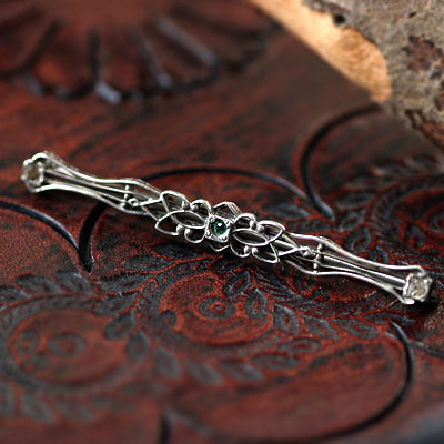 瀟洒なレースのようなデザインと細工のアンティーク・シルバー・ブローチ。アールヌーボー調の唐草パターンの中央には小さなエメラルド・グリーンのラインストーン、両端にはクリアーなラインストーンがセットされています。