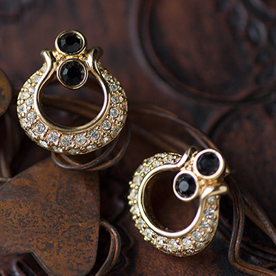 クリスタルの輝きにドキドキうっとり。ゴールドにブラックの組み合わせが大人っぽくクールで、二列に並んだパヴェの煌めきがすっきりとゴージャスな洗練されたヴィンテージ・ピアス。